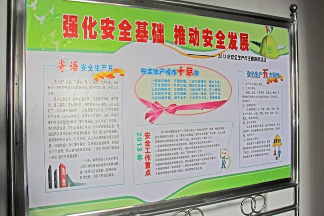 集團(tuán)資訊按照2013年“安全生產(chǎn)月”活動實施方案要求,公司所屬各單位張貼、懸掛安全生產(chǎn)警示語,突出宣傳“強(qiáng)化安全基礎(chǔ),推動安全發(fā)展”的活動主題。