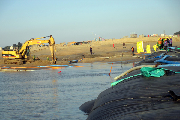 平潭綜合實(shí)驗(yàn)區(qū),主島為海壇島,位于福建省東部,與臺(tái)灣隔海相望,是中國(guó)大陸距離臺(tái)灣島最近的地方,是中國(guó)第五大島,有福建的“馬爾代夫”之稱。平潭綜合實(shí)驗(yàn)區(qū)如意湖防潮閘工程項(xiàng)目總投資1.3億元,我公司承建的土建工程包括排澇閘、防潮閘、公路橋、上下游兩岸翼墻、防沖消能、控制房等土建工程施工(含導(dǎo)流明渠開(kāi)挖、圍堰填筑)。平潭(簡(jiǎn)稱嵐)年平均風(fēng)速超過(guò)五級(jí)以上,大風(fēng)呼嘯,沒(méi)來(lái)這里感受不到風(fēng)有多大!依據(jù)工程設(shè)計(jì)及進(jìn)度要求,在落差8m潮汐中的軟基上進(jìn)行圍堰模袋充砂以截流海水,在惡劣地質(zhì)條件的海中建閘,與潮水賽跑、跟臺(tái)風(fēng)搶工期,潮起潮落,給工程建設(shè)平添了許多艱難與艱辛。
