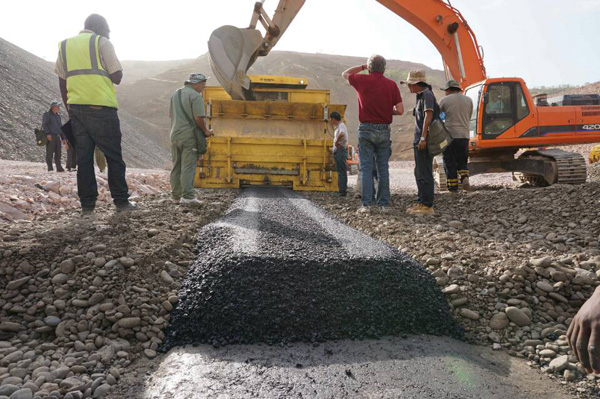 埃塞俄比亞旱季熾熱的風(fēng)撲打著人們的面龐,也映襯了瀝青混凝土芯墻現(xiàn)場(chǎng)火熱的施工場(chǎng)景。自從2015年3月6日簽訂合同以來(lái),Wolkite瀝青混凝土項(xiàng)目施工緊鑼密鼓,在進(jìn)行了大量實(shí)驗(yàn)和前期準(zhǔn)備的基礎(chǔ)上,取得了實(shí)質(zhì)性進(jìn)展,截止5月15日已完成從804m高程至816m高程的填筑,余下工作正有序進(jìn)行。