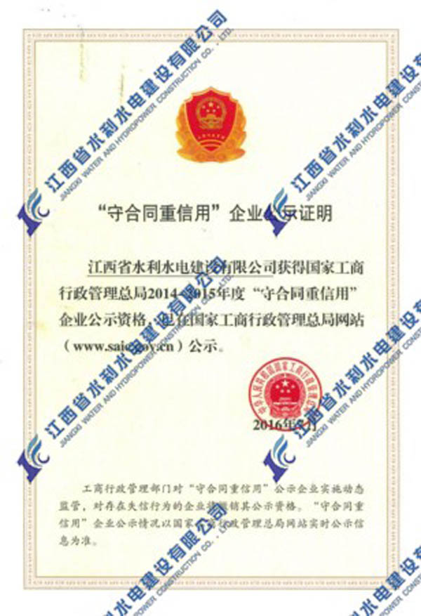 2016年我公司首次榮獲國(guó)家工商行政管理總局2014-2015年度“守合同重信用”企業(yè)公示資格。“守合同重信用”公示活動(dòng),是工商部門依托合同行政監(jiān)管職能組織開展的旨在推進(jìn)企業(yè)信用建設(shè)的“守重”企業(yè)公示活動(dòng),是長(zhǎng)期以來(lái)我國(guó)社會(huì)信用體系建設(shè)的重要組成部分。