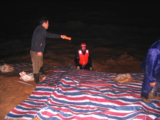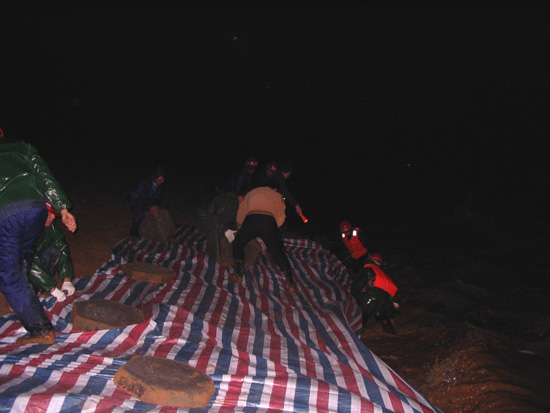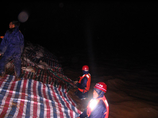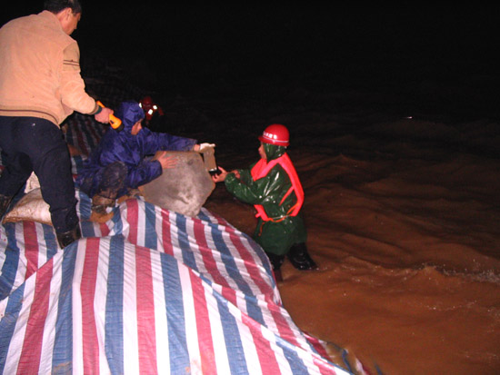 根據(jù)以往的施工經(jīng)驗,我們很快啟動了搶險應(yīng)急預(yù)案。但由于環(huán)境惡劣,考驗我們的時候到了,要發(fā)揚(yáng)我們江西水建人“特別能吃苦、特別能戰(zhàn)斗、特別能忍耐、特別能協(xié)作精神”的時候到了,我們與洪水搶時間、爭進(jìn)度,全體干群在漆黑的大堤上是一片穿梭奔跑的身影,大家齊心協(xié)力,手提肩扛,把一百多斤一塊的混凝土預(yù)制塊,一塊塊運(yùn)到堤腳,此時項目部總工曾俊平不顧江水的寒冷,帶領(lǐng)其它幾名員工,奮身躍入水中,在水下鋪設(shè)彩條布,而此時水下溫度只有10℃左右,渾濁江水一浪高過一浪拍打在他們的身上。大家顧不上寒冷,顧不上疲勞,顧不上饑餓,衣服濕了又干,干了又濕,分不清是哪次被汗水還是雨水弄濕的,在微弱的手電光照亮下鋪設(shè)了一條又一條彩布條,碼起了一道又一道沙包小堤。經(jīng)過大家的緊張奮戰(zhàn),終于幾處險情得到了控制,等到我們在忙碌中回過神來時,已經(jīng)是次日的凌晨三點(diǎn)多鐘,盡管大家拖著一副疲憊不堪的泥身子,但大家臉上裝滿了滿意和勝利的微笑,王總此時飽含真情地對大家說了一聲:“大家真的辛苦了,謝謝大家!”走在回家的路上,我正好與項目總工曾俊平走在一起,我看到他渾身濕漉漉的,我關(guān)心的問他在水中冷嗎?他笑笑說道:“這是關(guān)鍵時刻,再冷也要下”。他旁邊的同事告訴我,他是從下午三點(diǎn)鐘就一直在水里做事直到剛才,整整在水中浸泡了十二個小時。我們參加搶險的同志被曾俊平這種不怕困難、不畏艱險、不顧個人安危、敢于吃苦的精神深深感動著,真是我們學(xué)習(xí)的好榜樣!