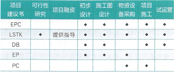 常見的工程總承包方式。工程總承包的主要方式有:設計采購施工總承包(EPC )、交鑰匙工程總承包 (LSTK )、設計建造工程總承包(DB )、設計采購總承包 (EP )、采購施工總承包(PC )。不同的承包方式,參與項目實施過程中的不同環(huán)節(jié)(見表1 )。