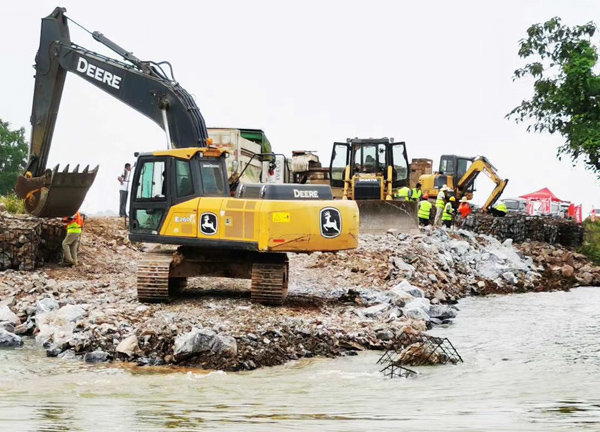 整個(gè)封堵工作共動(dòng)用水建公司400余名施工人員;調(diào)配挖機(jī)12臺(tái)、裝載機(jī)5臺(tái)、推土機(jī)2臺(tái)、運(yùn)輸車216臺(tái);調(diào)配塊石約3萬(wàn)立方米、卵石約2500立方米、粘土約9000立方米、1立方米鋼筋籠260多個(gè)、3噸重混凝土塊160多塊。